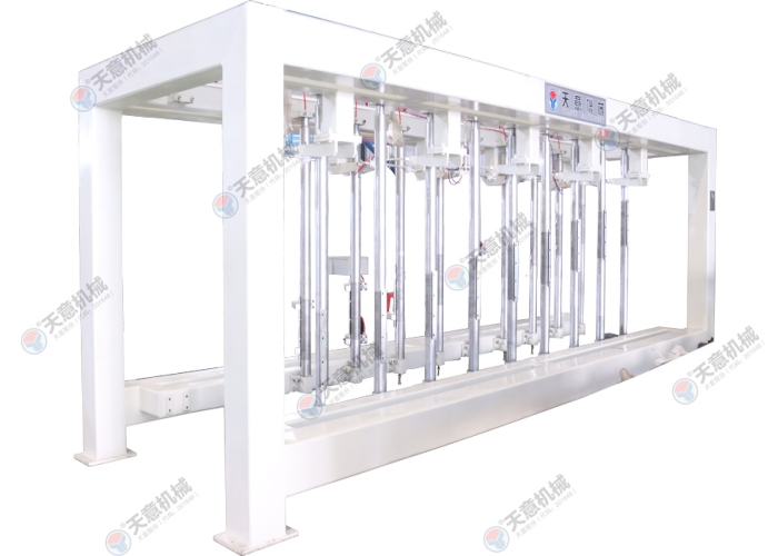 脫模后的坯體連同側(cè)板一起放置在切割小車上,切割小車由減速電機驅(qū)動行走,通過縱向切割機完成縱向切割,切割小車?yán)^續(xù)行走至橫向 切割機中間位置停止后,由小車置換裝置將側(cè)板連同坯體抬起,切割小車退回翻轉(zhuǎn)行車底下進行下一次承載脫模后的坯體,另外一部切割小車 進入置換裝置底下后, 置換裝置將側(cè)板連同坯體放置該切割小車上后,橫向切割動作后啟動進行橫向切割動作,切割完成后,切割小車再行走至確地行車底下,再由 翻轉(zhuǎn)去底行車將坯體去底(連側(cè)板)吊至蒸養(yǎng)小車上,切割小車范圍原始位置進行下一個切割循環(huán)。